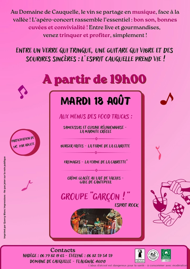 À partir de 19h, dans une ambiance conviviale et chaleureuse, vous apprécierez déguster un verre de vin ou un cocktail autour de barriques et tables de jardin en écoutant ou en dansant avec un groupe de musique. Des food trucks, des fromages, de la pâtisserie locale, des glaces feront également partie de la soirée.