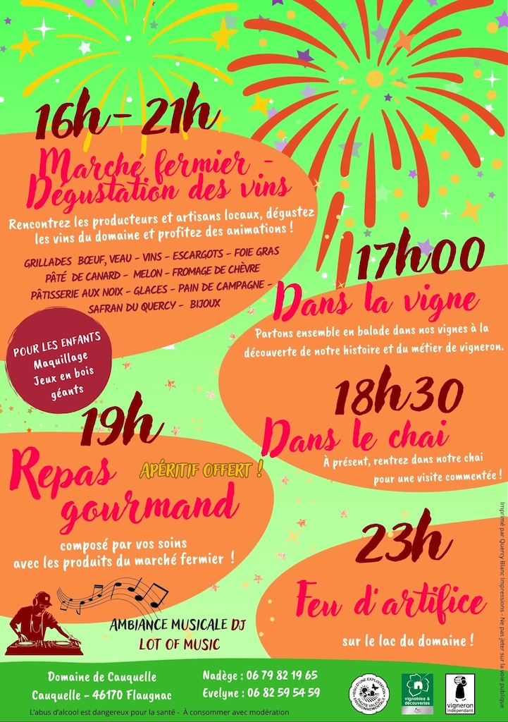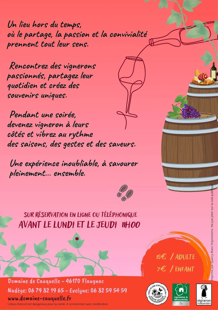 A partir de 17h, tous les lundis et jeudis soir, du mois de Juillet et d’Août, vous partirez avec Nadège ou Evelyne, vigneronnes passionnées, à la découverte du domaine de Cauquelle.
