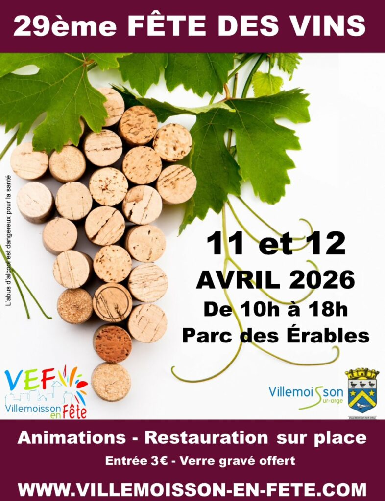Le Salon de la Fête des Vins de Villemoisson-sur-Orge (91) revient pour sa 29ᵉ édition les 11 et 12 avril 2026. Cet événement incontournable pour les amateurs de vin et de gastronomie réunira près de 70 exposants, exclusivement des producteurs, venus partager leur savoir-faire et leur passion.